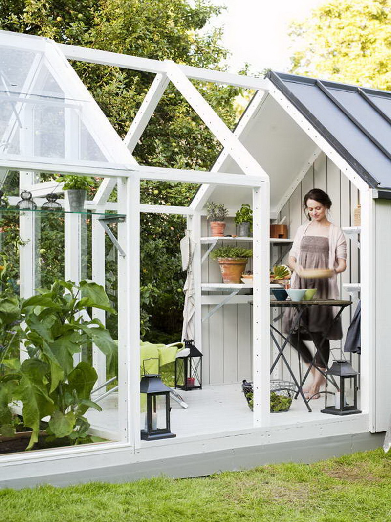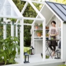 Comme mentionné ci-dessus, une serre en verre de haute qualité est capable de décorer une parcelle, devenant ainsi un élément essentiel d'un aménagement paysager harmonieux. Par exemple, sur la parcelle, ce sera très impressionnant et en même temps, une petite serre avec un toit à pignon angulaire et de petites fenêtres avec des cadres en bois de couleur blanche aura l’air confortable. Une telle structure sera plus attrayante si elle est équipée d’une base,garnie de briques décoratives de différentes nuances. Cette charmante structure peut être entourée de passerelles en pierre. Surtout de manière organique, un tel produit s'intégrera dans des bâtiments résidentiels en bois sur fond de grands arbres.