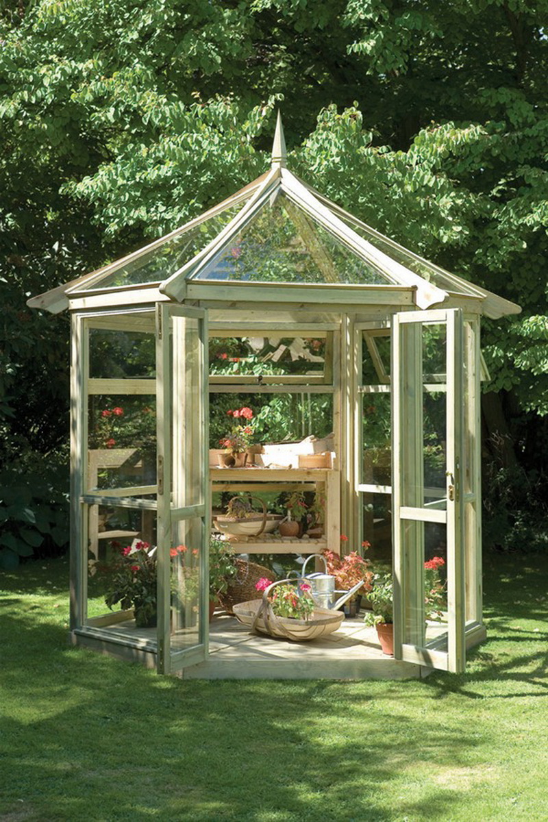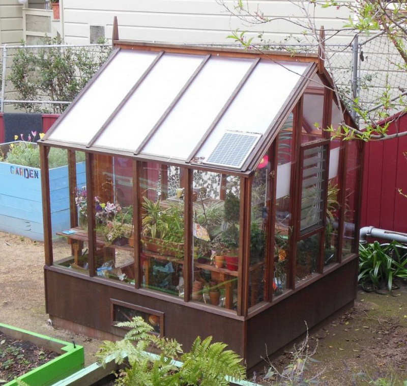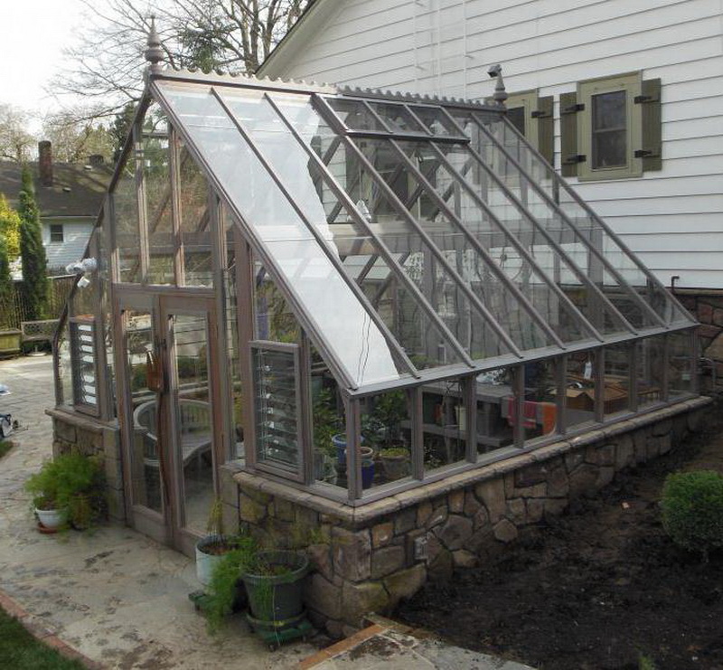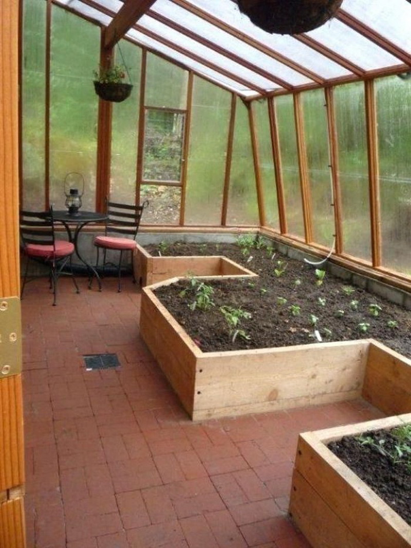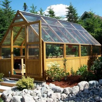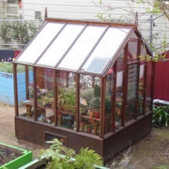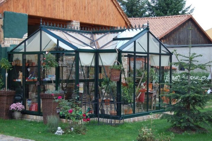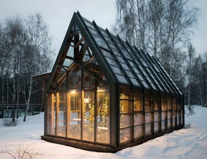 Les très belles serres sont constituées de cadres en bois sombre. De telles structures peuvent avoir des toits à pignon élevés, vitrés avec de petits segments de matériau fragile. À l’intérieur de tels bâtiments, l’éclairage artificiel doit être réalisé - la nuit, lorsque les lumières sont allumées, ces serres auront l’air mystérieux et original.