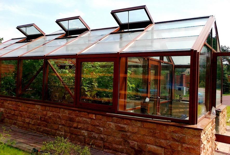Solidement sur des sites spacieux, hautes serres en verre avec une structure en métal coloré, teinte acajou. Ces conceptions ont l’air présent et concis, s’intégrant facilement à tous les ensembles. Ils peuvent être «soutenus» par des réverbères noirs au style rétro et de belles dalles.