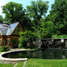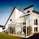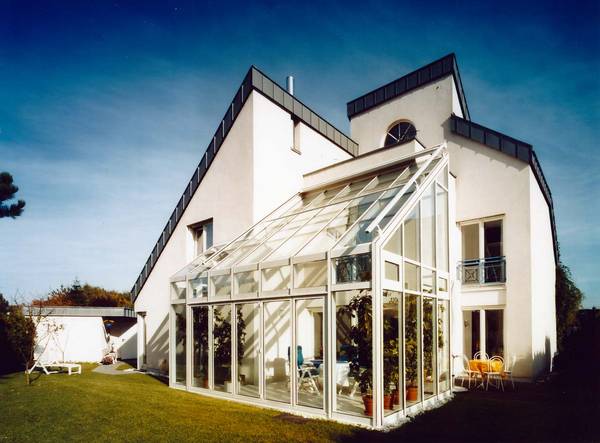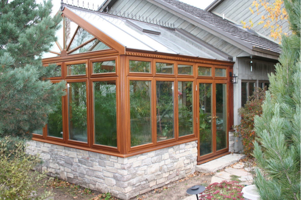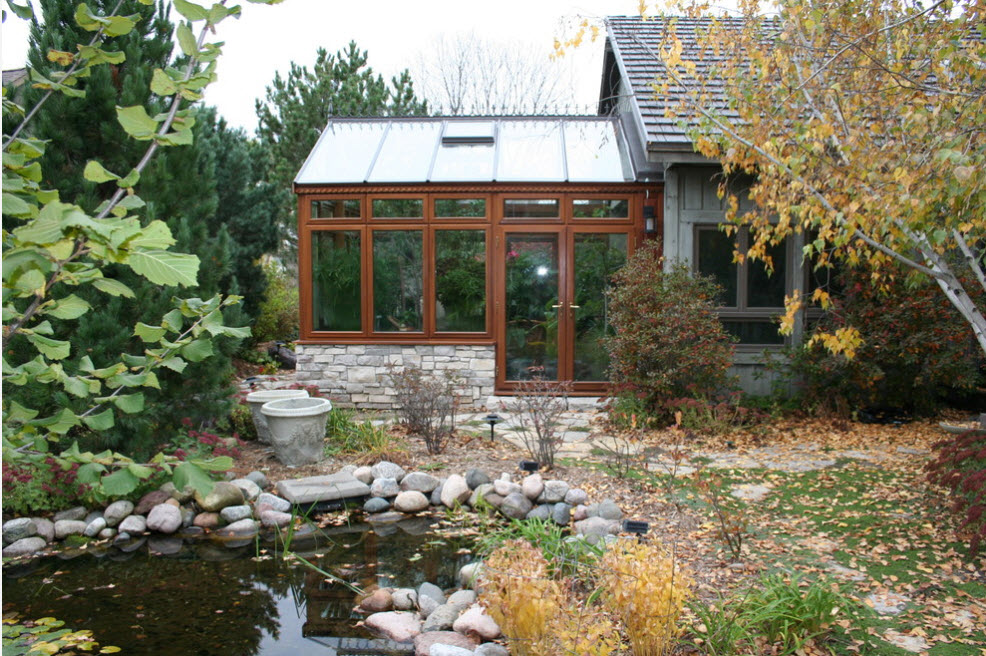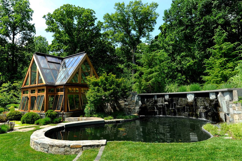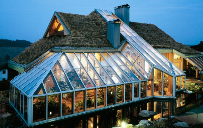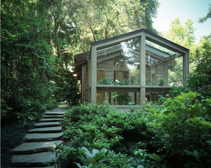 Pas moins intéressant va regarder et la serre sous la forme de "maison".Sa forme géométrique inhabituelle et ses lignes laconiques donneront au chalet un style particulier. Ces bâtiments sont bien placés à côté de la maison et complètent la zone de loisirs. La salle peut être équipée d'éclairage, de chauffage et d'eau.