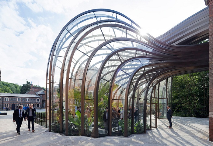 Un rôle énorme dans la conception joue et la conception de forme. En règle générale, elle est choisie sur la base du style général du problème. Il est souhaitable que la serre ressemble harmonieusement à l'arrière-plan d'un bâtiment résidentiel et d'un jardin. Par conséquent, sa conception doit prêter attention à la couleur et aux éléments décoratifs, qui doivent être répétés dans d'autres objets placés sur le site. Par exemple, de beaux motifs sur le boîtier peuvent être une continuation des compositions présentes sur les bancs, les kiosques, les clôtures et les pergolas. Ainsi, la serre ne ressemblera pas à un élément occasionnel et solitaire dans la conception de paysages.