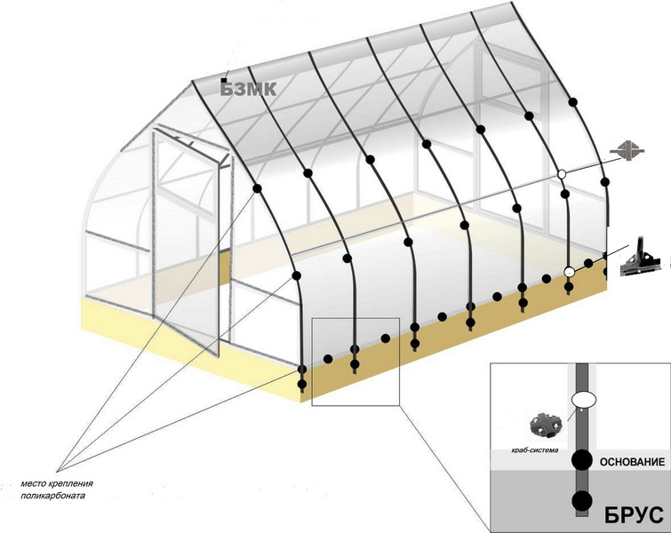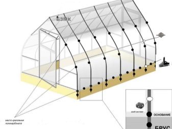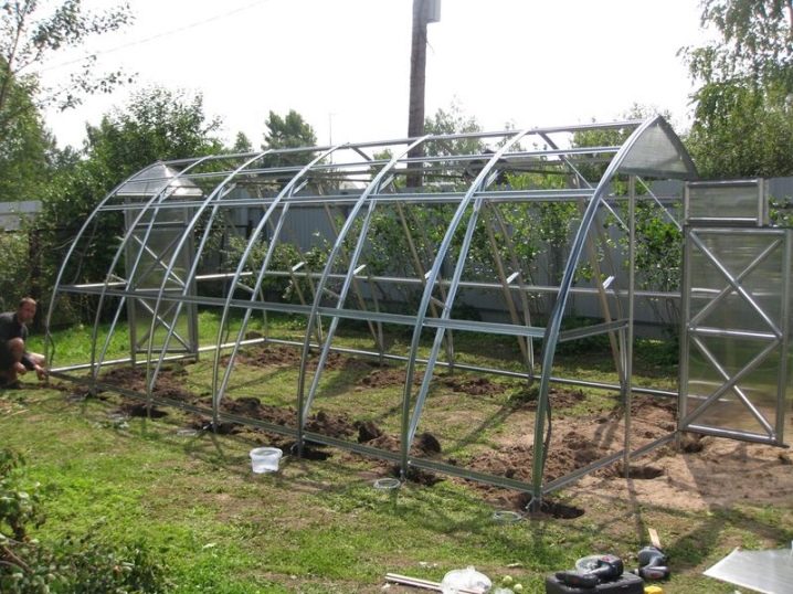 - Les pièces assemblées sont placées dans les rainures du sol. La deuxième rangée d'éléments de longeron doit être renforcée avec des joints en X. Les arcs restants sont connectés avec des éléments de liaison, puis montés avec la seconde extrémité de la structure.