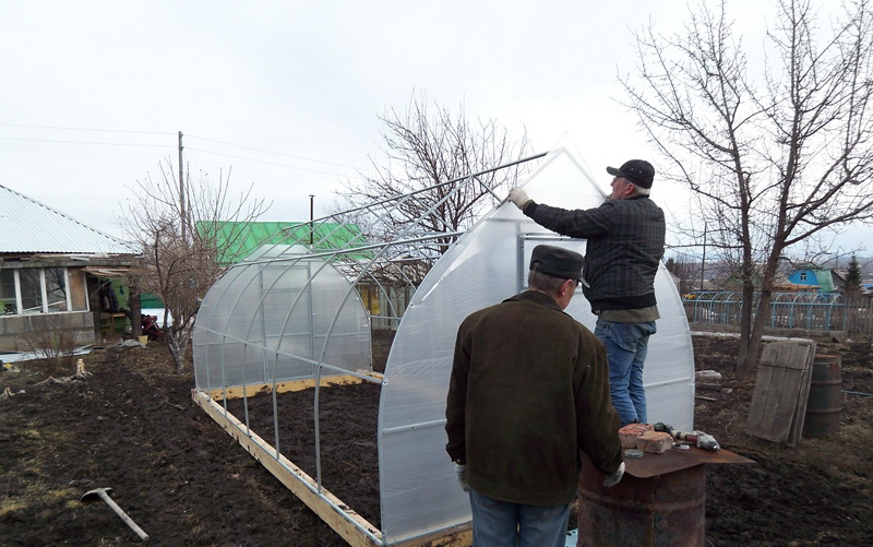 - Le tuyau profilé intermédiaire en forme d'arc est installé à partir de l'extrémité. Il est nécessaire de veiller à ce que les pièces soient situées à égale distance les unes des autres, ainsi que parallèlement au sol.