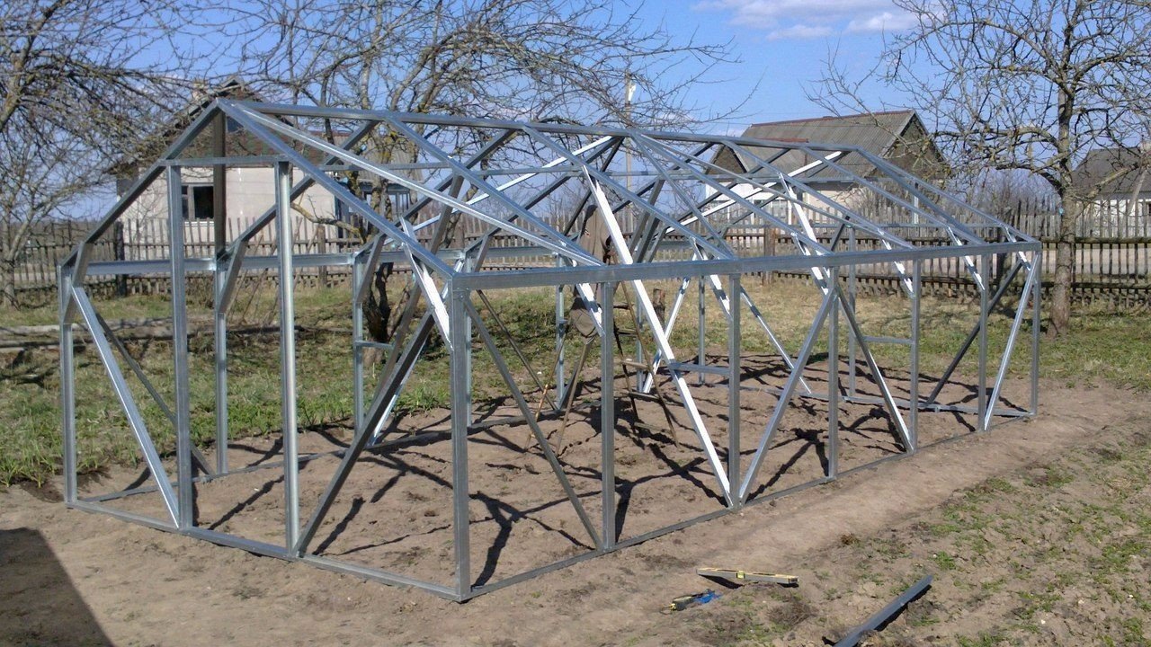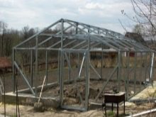 Il est recommandé de projeter la distance entre les montants jusqu’à 1 m.L’écartement entre les poutres de toit doit être de la même taille. Les barres de toit opposées se connectent. Le résultat est une "ferme" typique. Aux endroits des fenêtres et des portes il est nécessaire de marquer en plus les entretoises. Si le bâtiment est grand, vous devez ajouter des amplificateurs internes à cadre métallique. À partir du tube profilé, tous les éléments sont coupés et ensuite pliés dans la structure souhaitée.