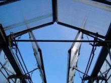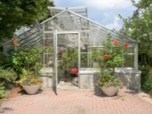 Mais le vent est beaucoup moins dangereux que d'utiliser un film. Tout le monde est conscient d'un défaut tel que la conductivité thermique accrue des verres. Dans la chaleur du soleil, ils se réchauffent beaucoup. Par conséquent, le microclimat pour les plantes est défavorable. Même l'ouverture du toit ne résout pas le problème jusqu'au bout. Mais le principal inconvénient d'une serre en verre est sa fragilité. Pour diverses raisons, le verre se brise facilement. Ils peuvent briser même une grosse grêle.