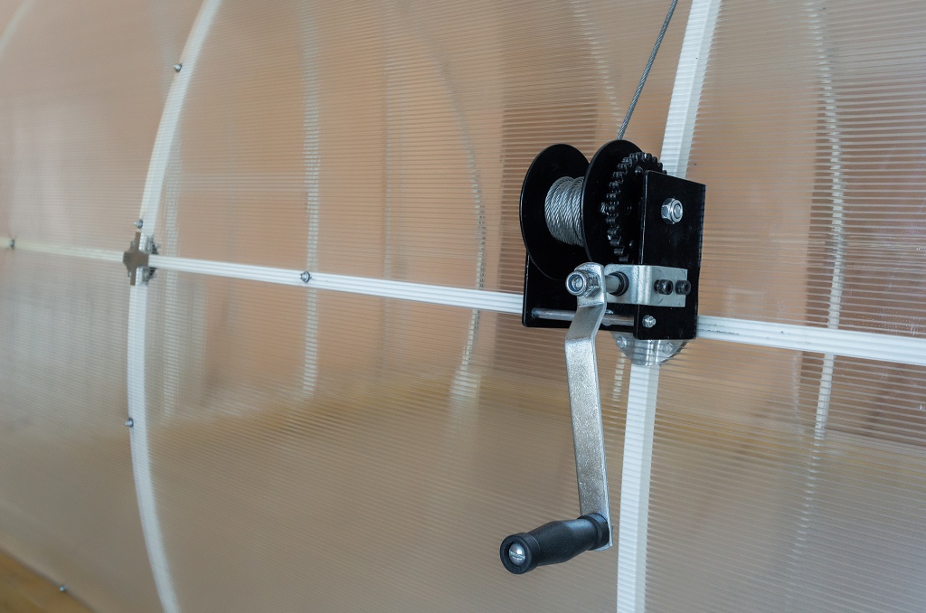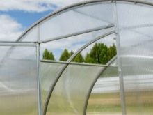 Le système de production biélorusse "Botanic Tulip" est équipé de portes qui peuvent être ouvertes de gauche à droite et de fenêtres pliantes. Il est impossible d'utiliser d'autres éléments, car tout est déjà configuré en usine. La "Tulipe" ouvre à la fois le toit et les deux murs. Sur les côtés, vous pouvez lever le matériau entre 0,8 et 0,9 m. Mais si les jardiniers décident qu'il y en a beaucoup, ils peuvent arrêter l'ascension à un niveau inférieur.