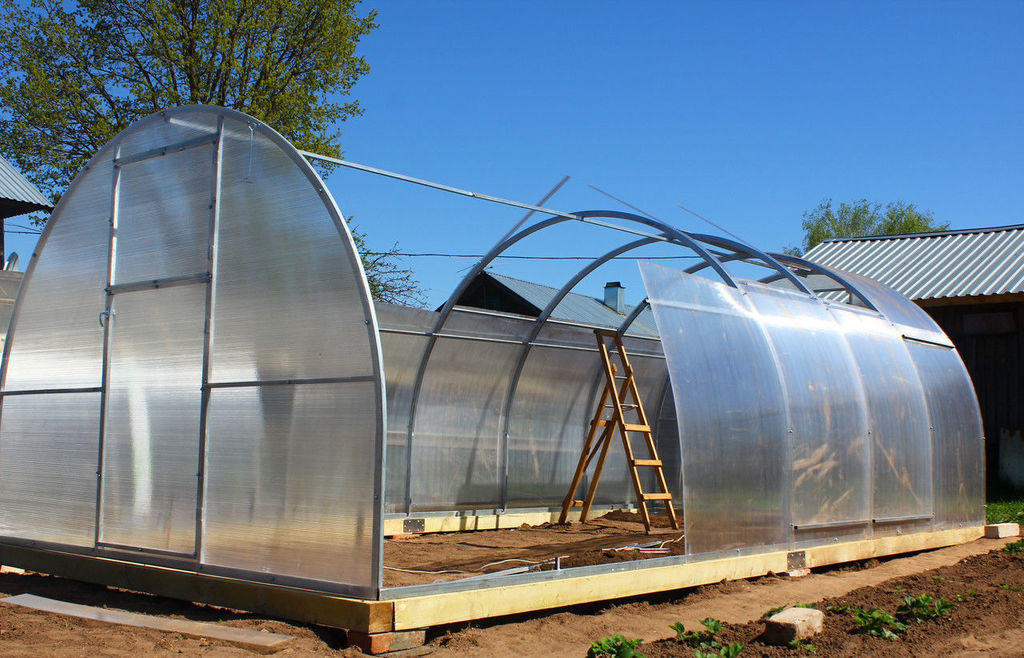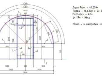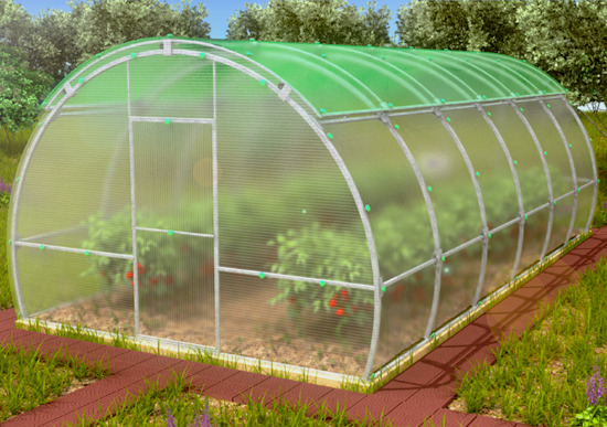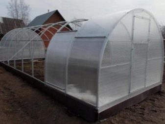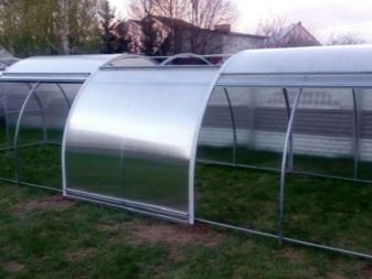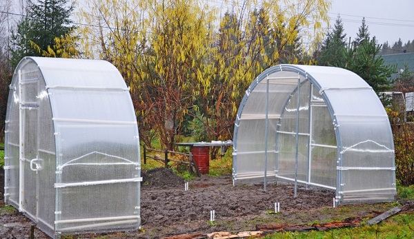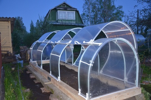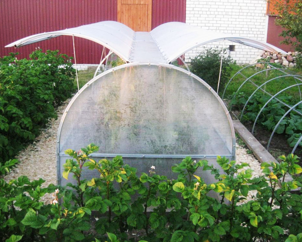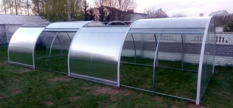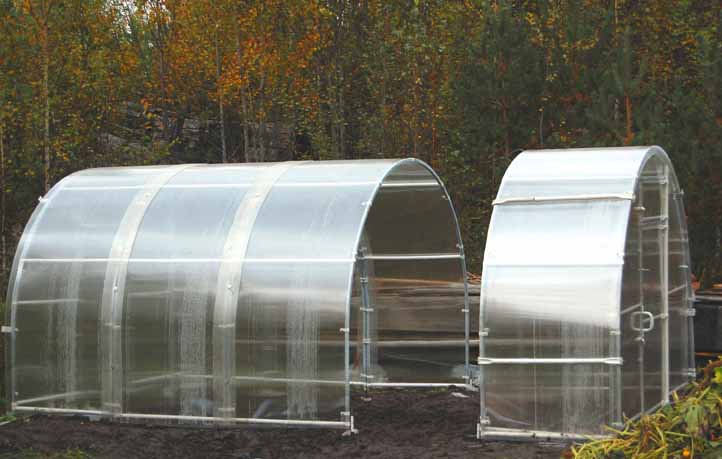 Le design voûté ressemble plus à un tunnel. Ses parties principales sont des arcs. Des murs plats sont installés aux extrémités. Pour la fabrication du cadre utilisé des angles en acier et en aluminium, qui peuvent être soudés ou vissés. L'acier est apprêté, puis peint ou recouvert d'une couche de zinc; L'aluminium est utilisé sans couches de protection.