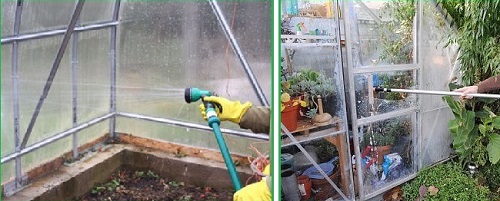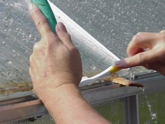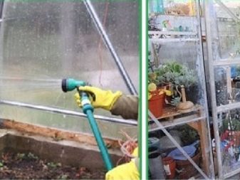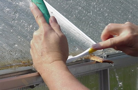 Lors du lavage, une attention particulière est portée à tous les joints et à toutes les frontières des éléments de la serre.C'est là qu'apparaissent le plus souvent des colonies de micro-organismes et d'insectes dangereux. Les éléments en polycarbonate doivent être lavés au printemps. Si plusieurs atterrissages sont prévus par saison, les surfaces doivent être nettoyées avant chaque atterrissage.