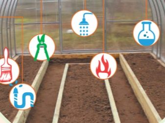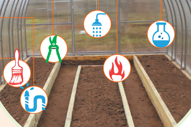 Les brosses dures, les matériaux abrasifs et les outils tranchants ne peuvent pas être utilisés pour le nettoyage. Ils endommageront la protection UV du polycarbonate. Pour détruire les agents pathogènes dans le sol, vous pouvez utiliser une ébullition abrupte au lieu d’un traitement au permanganate de potassium, puis recouvrir le sol de polyéthylène. Si les pièces métalliques sont rouillées, en fonction de la complexité du problème, peignez-les ou éliminez-les avec des composés spéciaux. Vérifiez le bon fonctionnement des mécanismes de la serre elle-même, ainsi que du matériel de chauffage, si nécessaire à la fin de l'automne et au printemps.