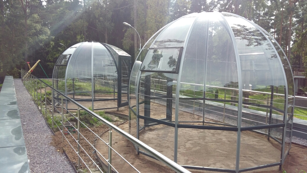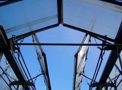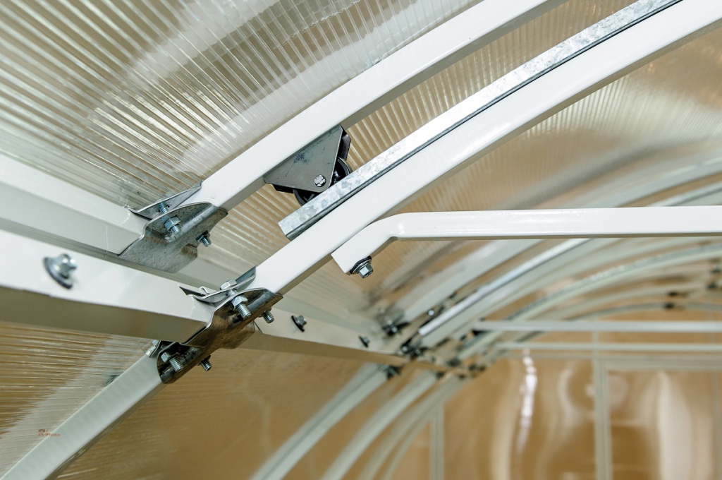 La serre du type "papillon" a des évents attachés à la poutre principale. Ils forment une sorte d'ailes sur les côtés. À la demande des propriétaires peuvent ouvrir le toit complètement ou seulement sa partie séparée. Les "ailes" sont plates et en forme d'arche.