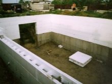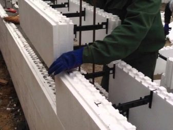 À l'étape suivante, la première chose à faire est de nettoyer le coffrage, après quoi vous pouvez construire des murs. Si votre choix s'est porté sur le thermobloc, le principe de son installation est identique à celui d'une brique. Vous seul devez vous assurer que les vides à l'intérieur du bloc se chevauchent. En conséquence, les murs devraient s'avérer être 50 cm plus haut que le niveau du sol.