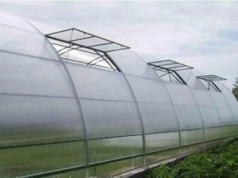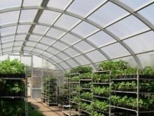 Une bonne option pour les régions avec des vents forts, car sa forme arquée offre un bon aérodynamisme. En outre, il convient de noter un certain nombre de fonctionnalités intéressantes. Le condensat qui se forme au sommet ne tombera pas directement sur les plantes, mais coulera simplement le long du mur. Ce petit avantage sera très utile lors de l'utilisation de lampes puissantes, ce qui provoquera de nombreuses petites brûlures sur le feuillage s'il y a de l'eau dessus.