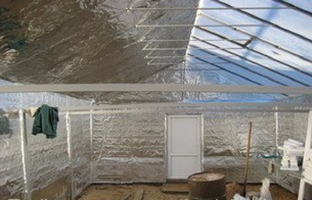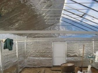 - Pour gagner la quantité de lumière reçue par les plantes et créer une isolation thermique supplémentaire, un film réfléchissant dense est installé sur les murs.