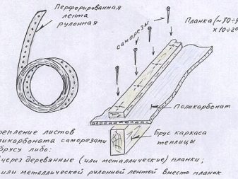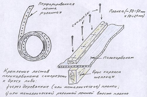 Le polycarbonate est fixé au cadre en bois à l’aide de rondelles et de vis à bois. Parmi les caractéristiques de l'installation, il convient de noter que la vis n'est pas directement vissée dans la feuille de polycarbonate, mais à travers une lame de bois, comme indiqué sur la figure. Après cela, il est vérifié s'il y a des fissures dans la structure. S'il y en a un, le problème est résolu par le montage de mousse. Tous les joints sont collés en matériau transparent, dans les cas extrêmes, cela peut être fait avec du ruban adhésif.