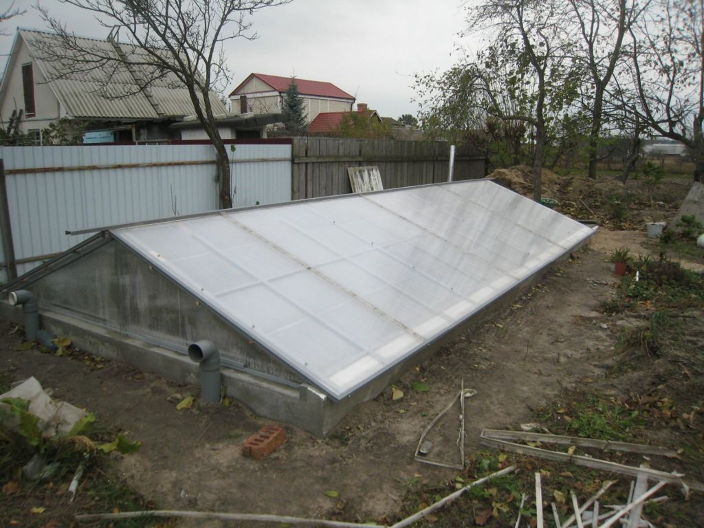 Probablement la conception la plus efficace qui vous permet d’utiliser de manière optimale les ressources naturelles, réduisant ainsi le coût du jardinier pour son fonctionnement.Le principe de fonctionnement d'une telle serre est le suivant: la base enfoncée dans le sol réduit considérablement les fuites de chaleur, tandis que la perte de lumière est si minime qu'elle peut être négligée. Et l’installation correcte des panneaux réfléchissants permettra de surpasser complètement les caractéristiques de conception, en recevant encore plus de lumière que la serre ordinaire.