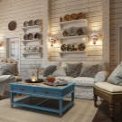 Avec l'aide de clapboard, vous pouvez créer un intérieur semi-antique spectaculaire. Pour ce faire, il peut être recouvert d’un vernis teinté, simple ou délirant ("vieilli", créant ainsi un revêtement craquelé). Le clap ainsi traité peut être gainé en totalité ou en une paroi de la pièce.
