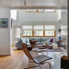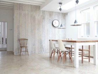En combinaison avec la structure de l'arbre, l'effet est vraiment génial. Une telle surface conviendra à tous les styles, elle s'harmonisera avec presque tous les environnements et toutes les couleurs.Une peinture translucide qui ne cache pas, mais souligne la texture en bois et donne une teinte blanche au matériau lui-même - une bonne option pour rafraîchir légèrement, actualiser l'intérieur sans modifications majeures.