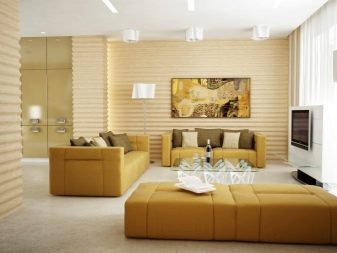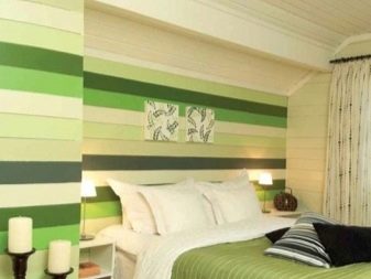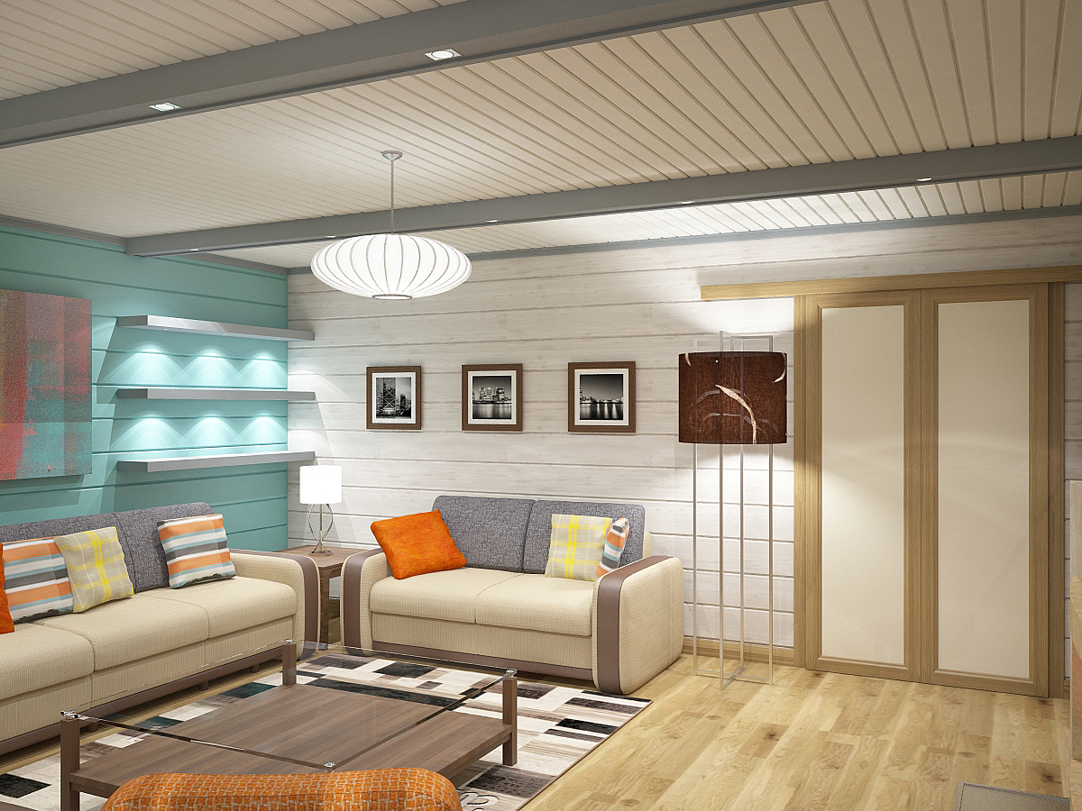 Des tons clairs et accrocheurs, peut-être même cachant la texture du bois, peuvent être utilisés dans la décoration de la salle dans le style disco ou dans l'esprit des années 60-70. Un mur décoré de cette manière (ou une partie de celui-ci) constituera un accent spectaculaire qui attirera immédiatement l’attention dès l’entrée dans une pièce.