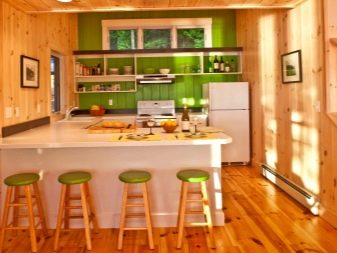 La cuisine décorée avec du bois ressemble, bien sûr, statut et attrayant. Mais dans ce cas, le matériau lui-même doit être protégé contre les facteurs externes - humidité, températures élevées, exposition possible aux produits chimiques et dommages mécaniques. La même chose vaut pour la salle de bain. Ici, une attention particulière doit être portée à la protection contre l'humidité.