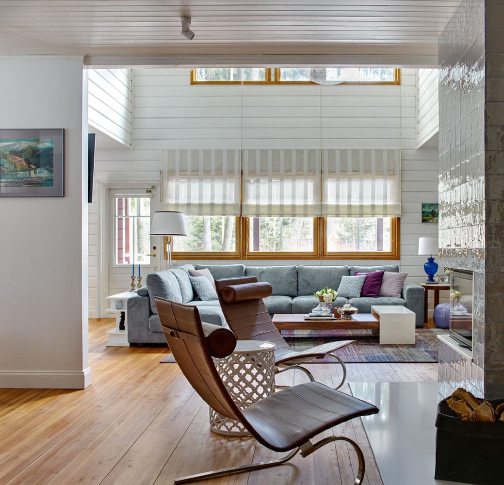 Dans une maison de campagne à la campagne avec des planches à découper, vous pouvez décorer non seulement un mur ou une partie de celui-ci, mais également toute la pièce. Le sol, le plafond et les murs en bois clair créeront un intérieur incroyablement confortable et harmonieux, empli de la chaleur naturelle de ce matériau populaire.