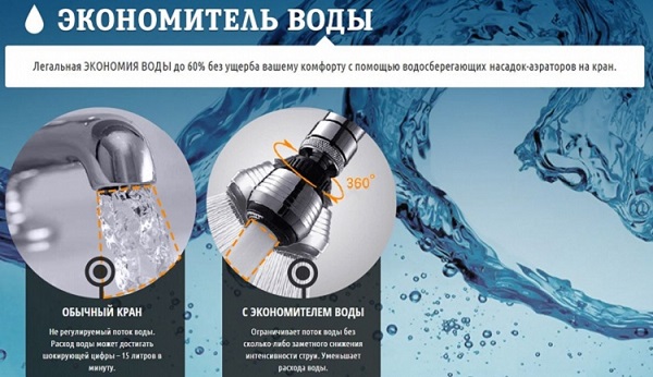 Une autre fonction de l'aérateur du mélangeur est l'économie d'eau. Bien que l'appareil lui-même ne soit pas très fiable et qu'il soit souvent nécessaire de le remplacer (au moins une fois par an), il réduit la consommation d'eau de deux fois ou plus.