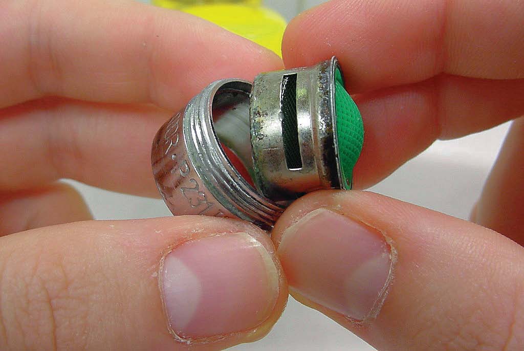 À l’aide d’une aiguille chaude ou tranchante cousue dans un tel joint, de nombreux trous sont percés de sorte qu’il ressemble à un filet à mailles fines. Les filets finis sont placés dans un corps de buse vide au lieu de filtres classiques, et la buse est fixée au bec. Un tel aérateur remplira toutes les fonctions qui lui sont assignées. Cependant, sa durée de vie est nettement inférieure à celle des produits achetés, en particulier avec les filets en laiton.