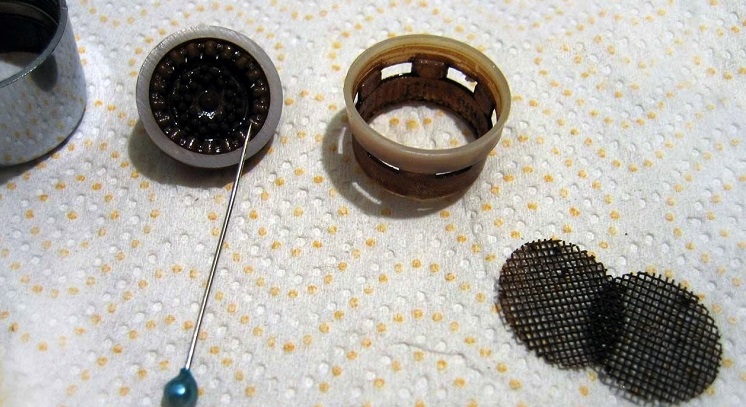 - Le boîtier lui-même est démonté et soigneusement rincé à l'eau courante et essuyé avec un chiffon humide. Les petits trous de la maille sont nettoyés avec une aiguille à coudre habituelle ou un poinçon fin, après quoi ils sont en outre lavés avec une forte pression d'eau.