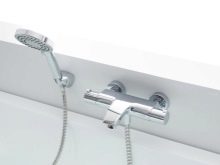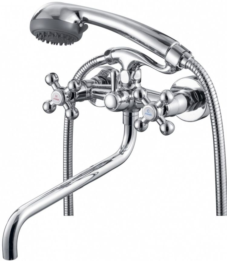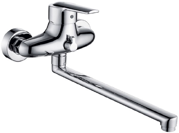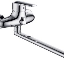 Pour un bain et un ajustement Orbit 20055. Un mélangeur intégré à la console de ce modèle est commandé par une version à levier unique. La vanne de verrouillage contient une cartouche en céramique, le bec est fabriqué sur le type rotatif de la forme habituelle. La connexion est établie à l’extérieur d’une connexion rigide à travers une paire de trous de montage. Un arrosoir et un aérateur sont fournis avec le mélangeur.La longueur du bec atteint 35 cm.