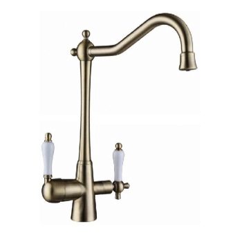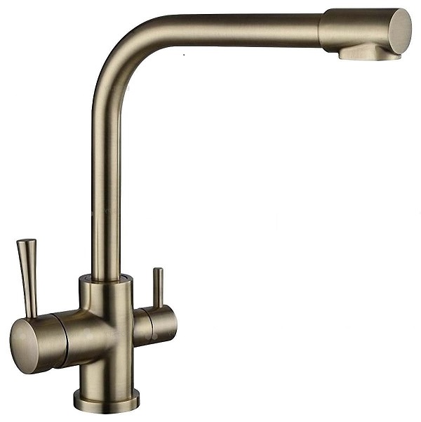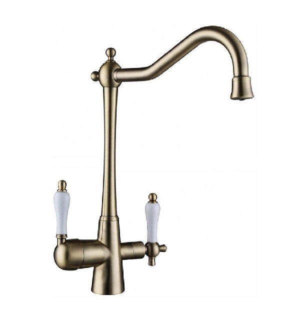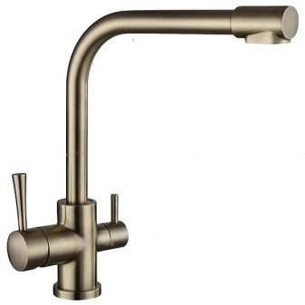 Vous pouvez également mettre sur la cuisine Grue Merkur 26044-3 Bronza. Il se distingue par une hauteur de bec rotatif (avec l'aérateur) de 29,8 cm et, au point le plus éloigné, de 33,2 cm, au format de la lettre G.La connexion du filtre est possible, le style correspond parfaitement aux principes du rétro.