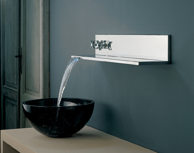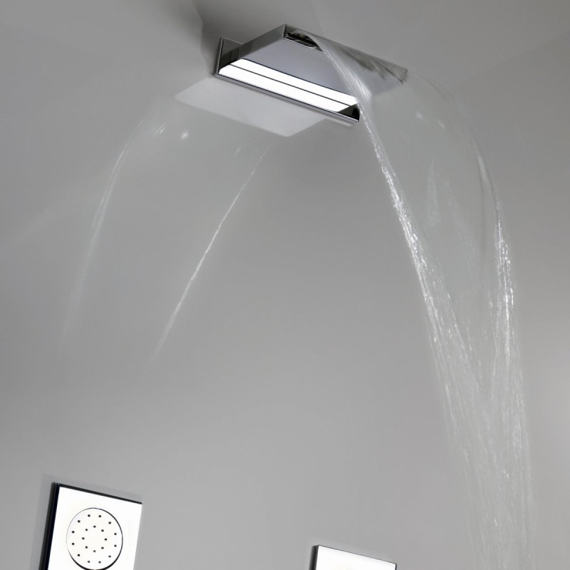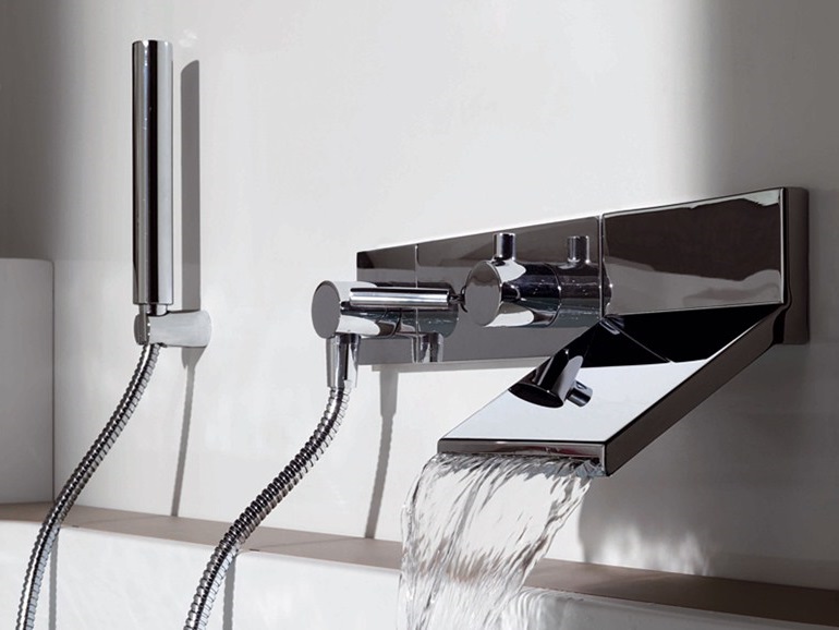 Le périphérique étant installé séparément, chaque nœud peut être placé à l'emplacement le plus approprié.par exemple, le mélangeur-cascade à mettre à côté du bec et la douche - dans le sens opposé. Un robinet mural avec un large bec en cascade est également disponible, son arrosoir est installé sur le mur, en choisissant une hauteur convenable à l'avance. Dans ce cas, l’alimentation en eau est cachée derrière un panneau décoratif ou une moulure.