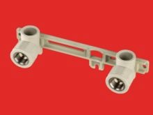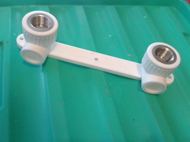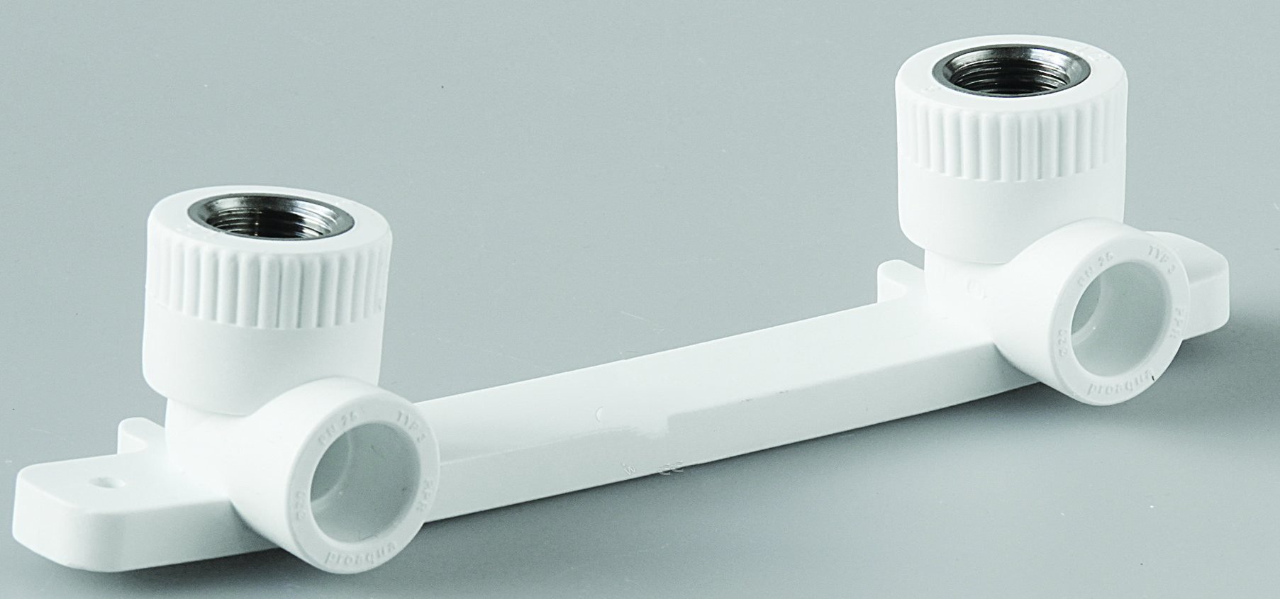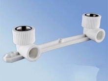- Le troisième type de produits est représenté par des modèles de tuyaux en PVC. Il s’agit d’un modèle simple ou double dans lequel la sortie d’eau est enfoncée dans le boîtier en plastique. De telles bandes sont complètement prêtes à l’installation et ne nécessitent pas d’auto-assemblage. Les prises d'eau dans ces lattes sont parfaitement compatibles avec les mélangeurs fabriqués dans les tailles traditionnelles, où la distance entre les axes des écrous correspond à 150 mm et les dimensions des tuyaux principaux et de leurs connexions égales à 20x1 / 2 et 25x1 / 2. Grâce à cette conception, il n’est pas nécessaire de centrer les points de connexion et aucun problème d’installation des planches.