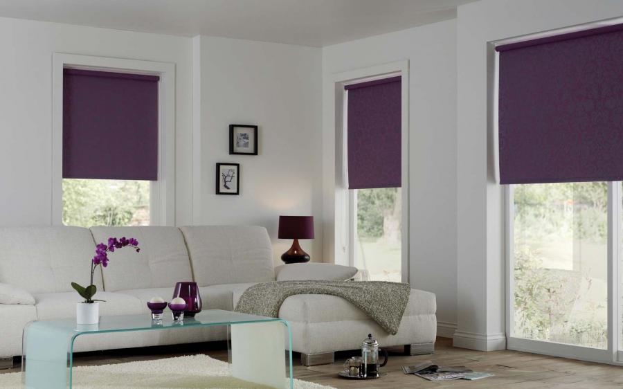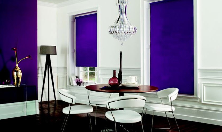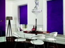 Dans le salon blanc de neige ou clair, des stores à rouleau contrastants agissent comme un accent brillant. Le violet est particulièrement beau contre les murs blancs. La nuance lumineuse soutient le décor de la pièce: une lampe de sol dans le coin, une paire de bougies et un vase avec des fleurs.