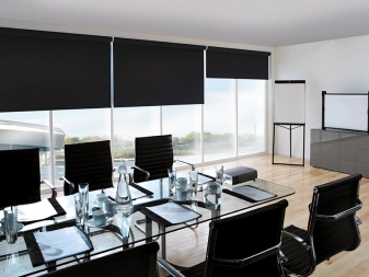Tous les stores Blackout sont présentés exclusivement au format rouleau. Le fait est que les stores à lamelles habituels laissent entrer la lumière et ne sont pas en mesure de protéger la pièce du soleil aussi efficacement. Les modèles légèrement transparents peuvent être en polyester, coton avec impuretés, fibre de verre, nylon. Leur conception peut être: