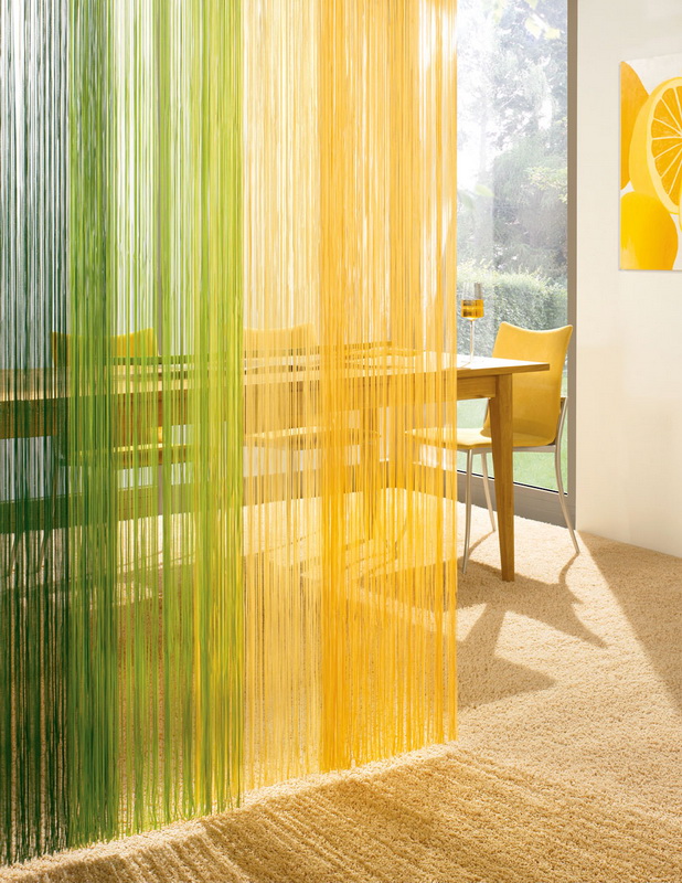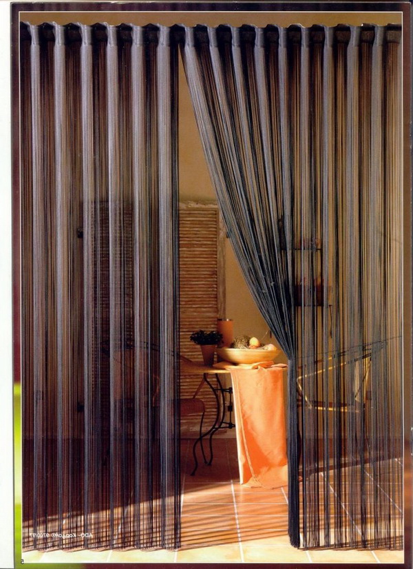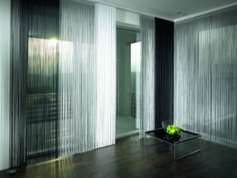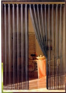 - "String" (Breeze, Rain). Un type intéressant de toiles de fenêtre, constituées de lattes en filament (corde). Ils laissent passer des rayons de lumière diffuse et jouent le rôle d’élément décoratif à l’intérieur, mais en même temps suffisamment denses pour faire face à la fonction de rideau. La principale différence avec les rideaux épais est qu’ils ne pèsent pas en bas."Brosse" de cordes tombe librement sur le sol.