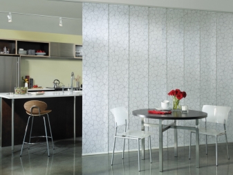 Les modèles compacts conviennent à la cuisine.qui n'interfèrent pas avec la ventilation de la pièce et réduisent le risque d'inflammation des rideaux depuis la surface de cuisson à proximité. Dans le garde-manger, vous pouvez installer des stores, harmonica; Ils conviendront également pour zoner une pièce ou une cloison dans le couloir.
