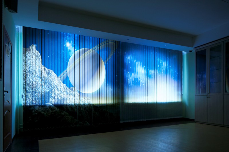 Le contrôle du système peut être automatique ou manuel. Changer la position des éléments modifie le niveau d'éclairage dans la pièce. Lorsque deux bandes opaques coïncident dans la pièce, elles deviennent plus sombres et la coïncidence des parties transparentes devient plus claire.